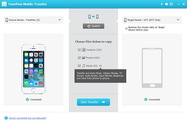 FonePaw Mobile Transfer is a tool for transferring files from Android smartphone to iPhone. Simply connect both phones to your computer and click Start Transfer. Phone numbers, music, videos and other media files will be transferred to the new phone. Manufacturers supported - Apple, Samsung, HTC, Sony, Motorola, LG, Huawei or ZTE.