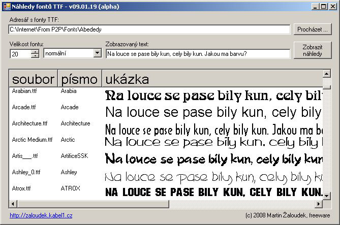 This application displays previews of true-type fonts (TTF) in an arbitrary directory. Thus, the fonts do not need to be installed on the operating system. Suitable, for example, for designers and graphic artists who are selecting a suitable font for a graphic work from one of their font libraries.