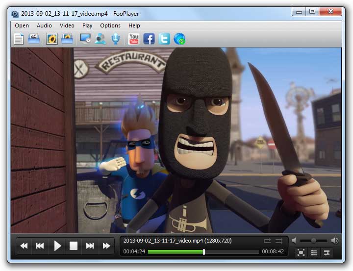 FooPlayer is able to play almost all video and audio formats such as AVI, MP4, MKV, MOV, FLV, MPEG, MP3, WAV, OGG, FLAC, VOB, ASF, WMV, WMA, RM, RMVB, DVD, (S)VCD and more. FooPlayer can play media from a file, file folder, DVD/VCD or your specified favorite playlists.