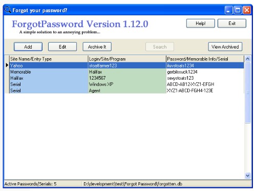 Forgot Password is a small database utility that allows you to backup and manage your logins, passwords and serial numbers. Program features: