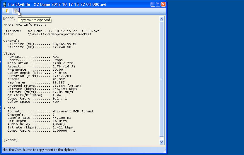 FRAFS Avi Info is an application that accumulates essential information about AVI video files, such as resolution, frame rate, bit rate, codec, aspect ratio, color depth, audio format, number of channels, bit depth, delay or compression ratio.