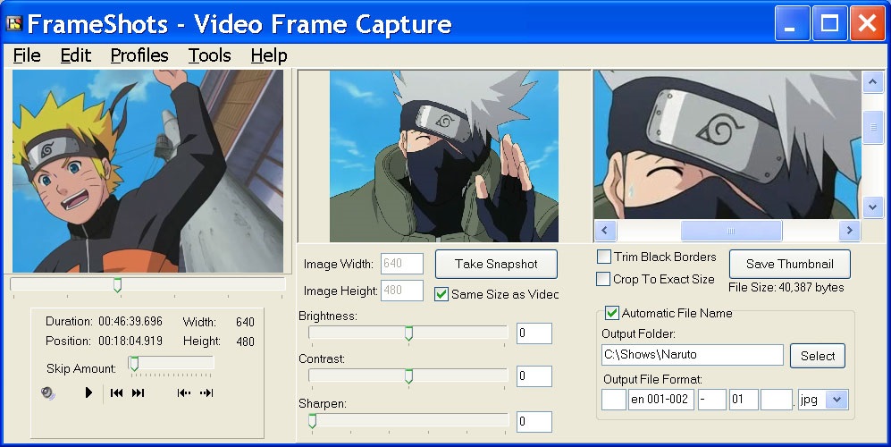 FrameShots was created as a very simple, powerful video capture program. The software will take snapshots of your video such as: MPEG, DivX, Xvid, WMV, AVI or other movie files that Windows Media Player can play. You can quickly and easily skip one frame and capture exactly the right frame in the video file and save it to a file.