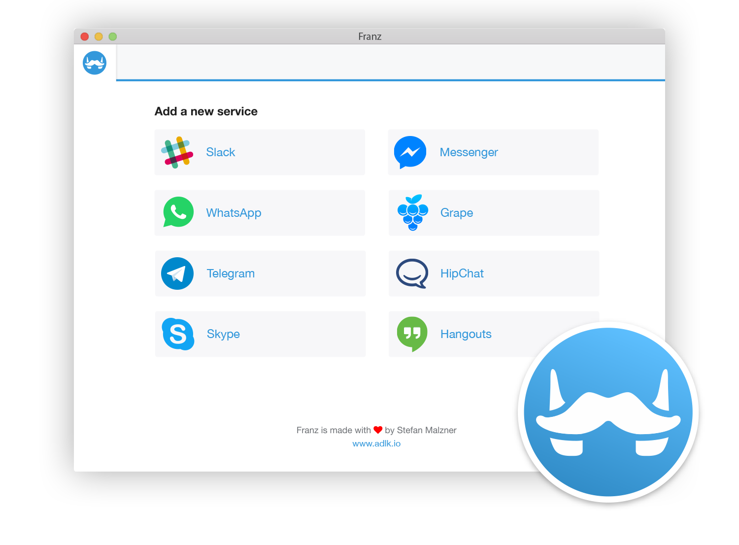 Franz is a free app that includes support for several internet communication services such as Slack, WhatsApp, WeChat, HipChat, Facebook Messenger, Telegram, Google Hangouts, GroupMe, Skype and Grape. Through the app you can chat, send pictures or files, audio recordings etc. Emoticons are included.