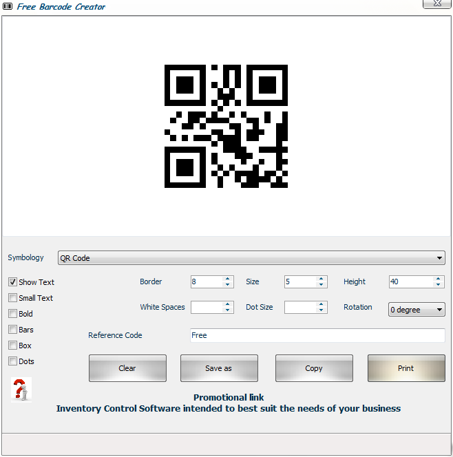 Free BarCode Creator allows you to generate over 50 types of barcodes such as Code 128, Data Matrix, USPS OneCode, EAN-128, UPC/EAN, ITF, QR Code, Code 16k, PDF417, MicroPDF417, LOGMARS, Maxicode, GS1 DataBar, Aztec Code, Aztec Runes, Data Matrix, Composite Symbols and more. It supports one and two dimensional standards, the generated code can be saved as a bitmap, copied to the clipboard or printed directly.