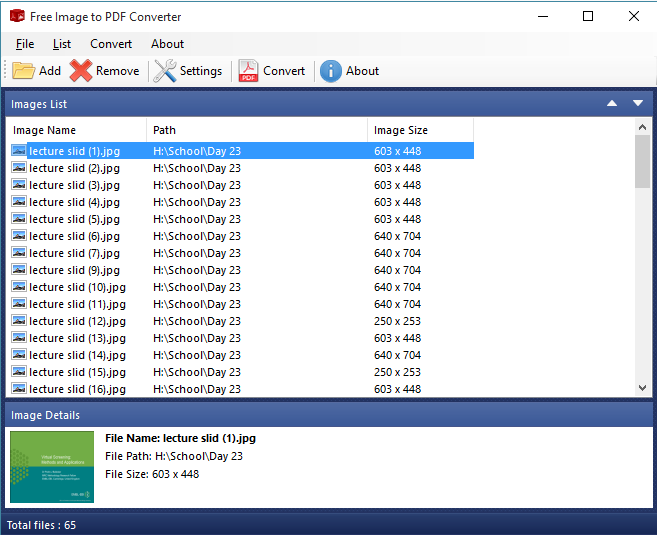 Free Image to PDF Converter is an easy-to-use software designed to create a standalone PDF document from any number of selected images or photos. It works with all commonly used file formats. You can change the width, height, title, subject, author, etc. of the PDF document