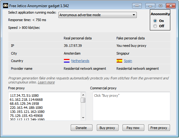 Free Jetico Anonymizer gadget is a small tool designed to surf the Internet anonymously. The tool offers a large number of addresses to anonymous free proxy servers. The very simple setup makes it very easy to use.