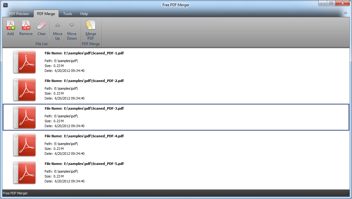 Free PDF Merger is a simple tool that can merge PDF files and preserve their original formatting. You can add documents in batch mode. It uses a simple user interface that allows you to select the PDF documents you want and then you can click to merge them into one. The program displays information about the path, creation date, file size of each document. It also includes a built-in viewer that allows you to examine the created files in detail or print them on paper. Access prevention can be secured with a password.