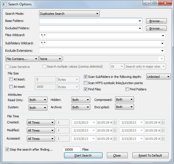 SearchMyFiles offers an easy way to find and remove duplicate files on your computer. It allows you to set file attributes for searching such as, hidden files, read-only, compressed, system, archived and encrypted.