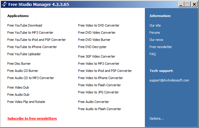 Free Studio is a standalone package that includes all programs from DVDVideoSoft for working with DVD, video and audio files.