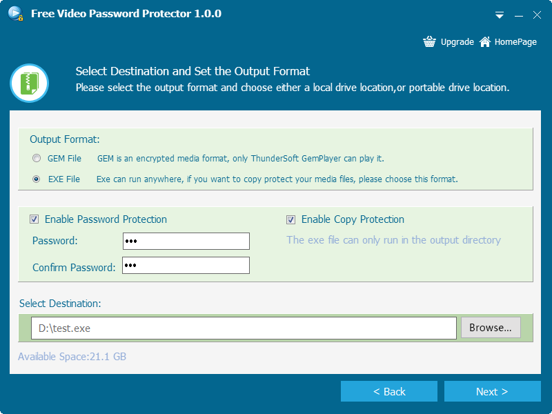 Free Video Password Protector is an easy-to-use tool to protect your video files with a password. With this program you can encrypt your videos, audios, images into GEM file or EXE format which is password protected. For files exported as GEM, ThunderSoft GemPlayer is required. It supports encrypting files in many input formats typical for storing videos, music or photos, such as WMV, MOV, AVI, MP4, MP3, WMA, WAV, OGG, JPG, GIF, TIFF or PNG.