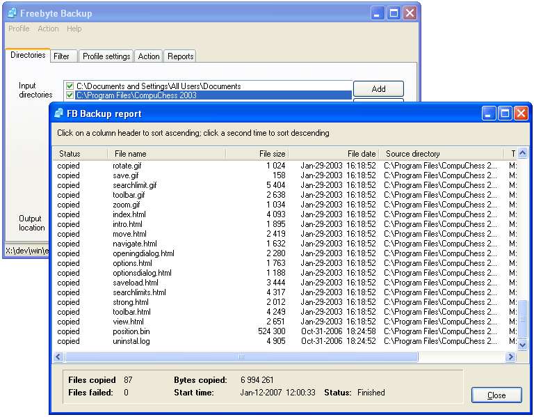 Freebyte Backup is backup software that allows you to easily copy a large number of files and directories from different sources to a single backup directory. The program backs up all files according to the criteria you specify (e.g. .doc only, ...).
