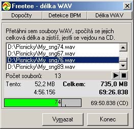 Freetee is divided into three parts - calculations, BPM detection and WAV length. The first part, Calculations, can calculate bpm, drum interval, beat count and loop length based on arbitrary values you enter. So, for example, if you know the length of a loop and the number of beats in it, the program will calculate the exact bpm, and so on. The next part, BPM Detection, measures bpm by periodically pressing a key according to the beat. The last part, WAV Length, can calculate the total length of any WAV files, so you'll know if they'll fit on your CD. For completeness, it adds a two-second pause between tracks.