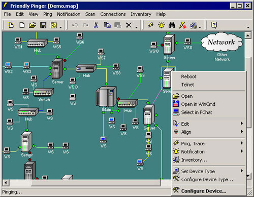The program monitors pings to the addresses you specify and set. For each address you can set what device it is. Friendly Pinger assigns an image to the address according to the technical specification and draws a map. The status of the device at a given address is then shown by a green/red dot.