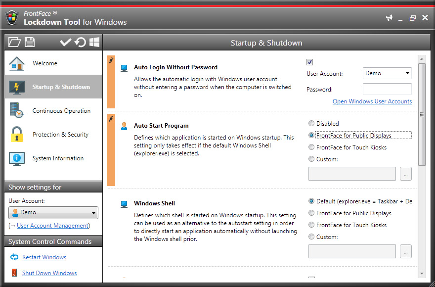 FrontFace Lockdown Tool is an application that allows you to temporarily restrict operating system functions in order to implement a computer kiosk accessible to the public. It contains a large set of settings for example to disable automatic updates,hardware acceleration, activate screensaver, lock task manager, lock keyboard shortcuts, etc. Any configuration can be saved as a profile, which can then be used on any other Windows computer with a single click. In addition, you can choose which Windows user accounts the profile is applied to.