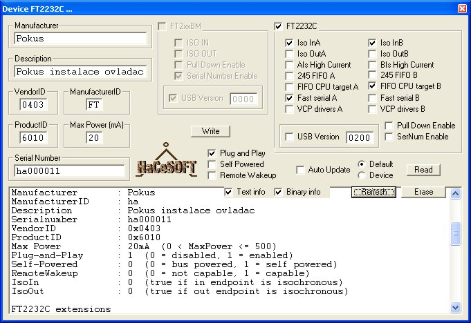 The FTDI EEPROM SCANNER program can be divided into two independent parts. One which contains configuration elements for the desired FTDI circuit function and additionally buttons. Both parts are independent of each other. This can be successfully used for searching through various devices without changing the control settings when configuring another device with FTDI circuit.