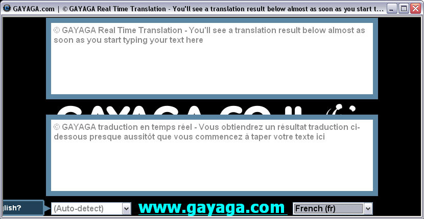 Gayaga Real Time Translation is a free and easy-to-use translation tool that allows you to translate texts in real time. The program supports 75 different languages, including English. The user interface is simple and intuitive. You enter the text you want to translate in the top field and the translation is displayed in the bottom field. You can select from different languages in the self-expanding list. The program does not need to be installed, so you can run it from a USB stick or other portable device.