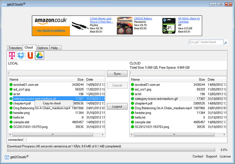 get2Clouds is a useful tool to easily transfer and synchronize data between your hard drive and cloud storage (Google Drive, Dropbox, Telekom Cloud, Microsoft SkyDrive, SugarSync, Box, etc.). Files can be encrypted before transfer and remote file management is also available.