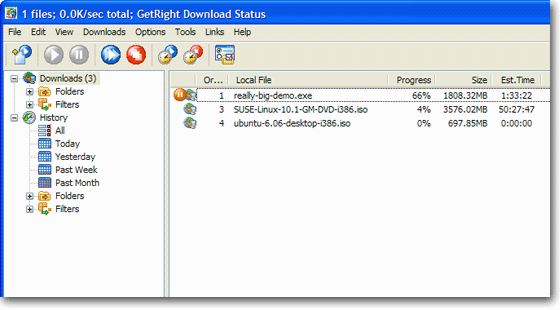 This program allows you to interrupt a download (pause), resume an interrupted download, search the ftp archive to find a faster file link, and disconnect the internet or shut down the computer when the file is finished downloading.