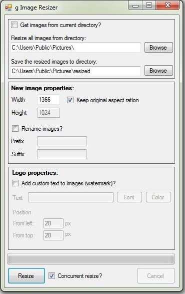 gImageResizer is a simple application for bulk resizing and also for renaming images and digital photos. There is also an option to add a watermark to a photo. The program has very intuitive controls, just select the source and destination folder with images and enter the desired parameters.