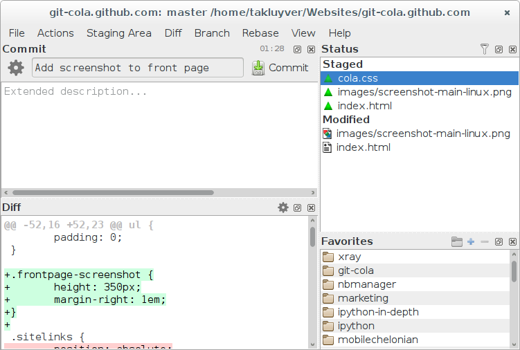 git-cola is a powerful graphical user interface for Git. It is written in Python (v2 + v3) and Git. It allows integration into the Windows Explorer context menu. It also allows you to create and join branches, export tarball files from Git, apply patches or use the browser to get history from remote repositories. There are also tools to show differences between older and newer versions of a file, create and edit tags, customize the editor, etc.
