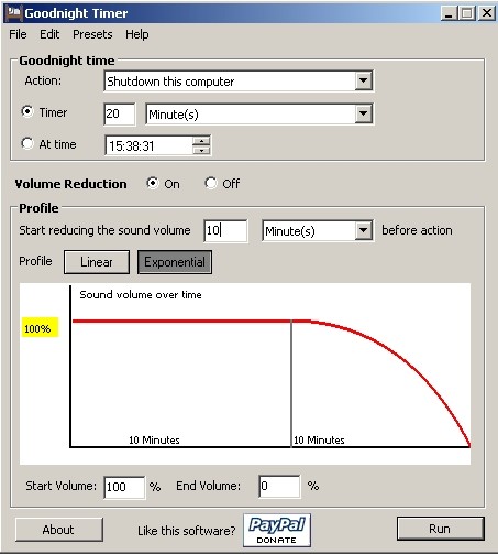 Goodnight timer is a great app that you will appreciate if you like to listen to music or other audio/video via pc and fall asleep to it. Goodnight timer will gradually lower the volume of the audio and turn off the computer at a predetermined time. You can set the volume reduction (linear and exponential profile), the start of when to turn the sound down and its duration.