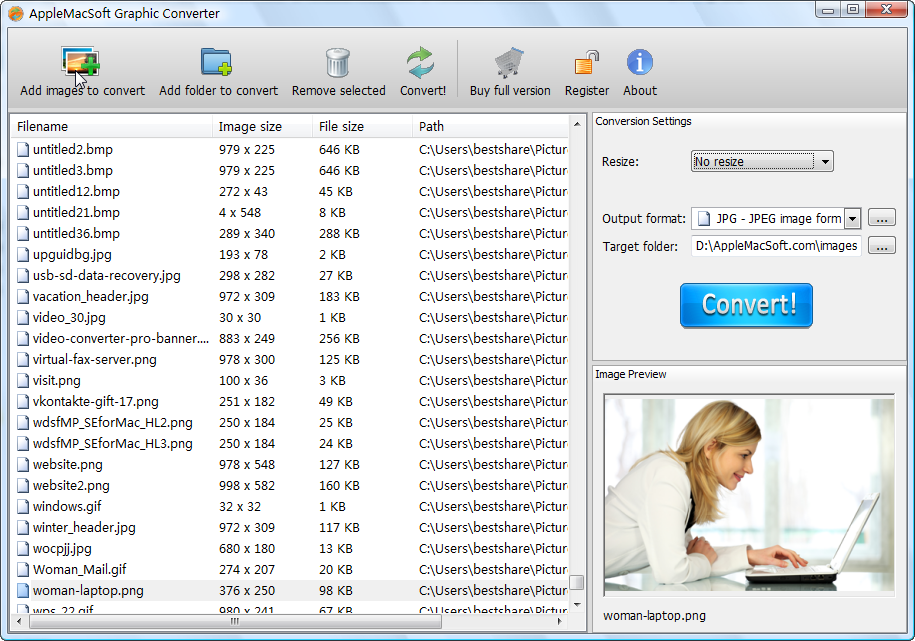 Graphic Converter is an easy-to-use and powerful tool for batch conversion and resizing of images and digital photos that supports more than 50 graphic formats including JPG, PNG, TIFF, GIF, BMP, SVG, TGA, ICO, PICT, PCT, PSD, RAW and many more. The size can be automatically resized in the same conversion process.