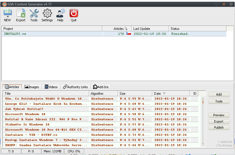 GSA Content Generator works by entering keywords, then it searches the internet based on these words, once it has enough pages loaded, the application starts to compile articles with text. The result is texts on a specific topic according to the keywords entered, composed of different web pages, making the content unique. The application is in English but can generate articles in Czech as well. However, the resulting text often needs to be fine-tuned to make sense and not get lost in the context.
