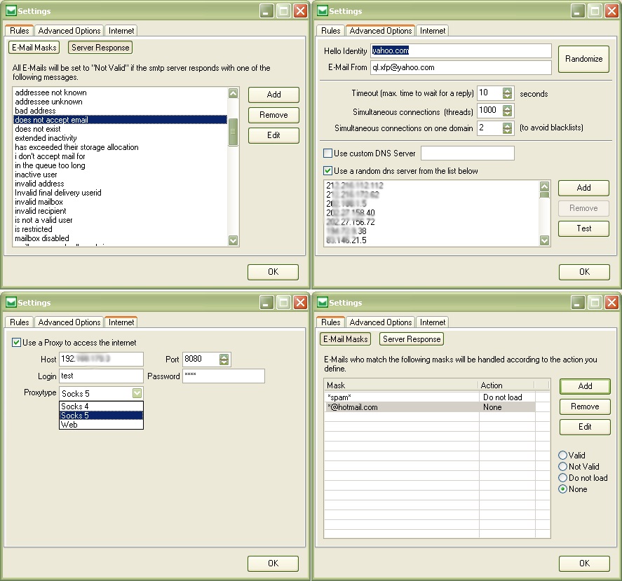 GSA Email Verifier will verify email addresses from your address book, Microsoft Outlook contacts, Windows address book and many other formats and see if they are still valid. This software allows you to clean up your contact and mailing lists by removing "bad" emails. Additionally, you will probably want to remove any administrative addresses such as nospam@, orders@, support@, webmaster@ that you do not want to send emails to. This can be done using either the included search tool, or predefined rules that set the email to automatically valid/invalid or remove from the list. This email checker is a powerful and reliable multi-threaded program that is capable of handling very large volumes of email addresses providing high speed email verification (with over 100,000 email verifications per hour [ 1 ]).