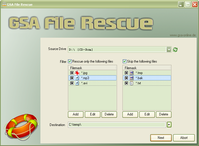 GSA File Rescue is a professional application designed to recover data from unreadable CDs and DVDs. Simply insert the disc into the drive and the program will copy the data to the specified directory even from a very scratched disc.