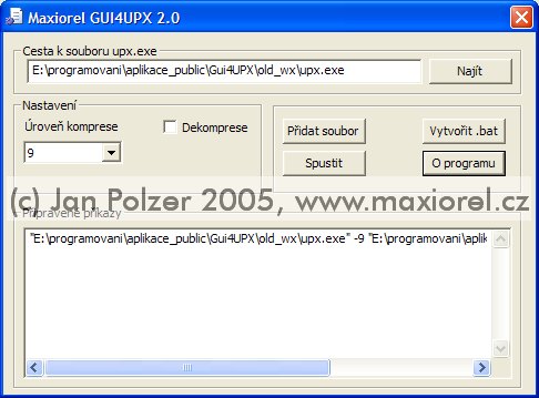The GUI4UPX program was created as a simple tool for using the UPX compressor. In the graphical environment, it allows you to select the file to be compressed, set its level and start it. Files can also be easily decompressed. Since UPX is controlled via the command line, GUI4UPX displays a preview of the command needed.
