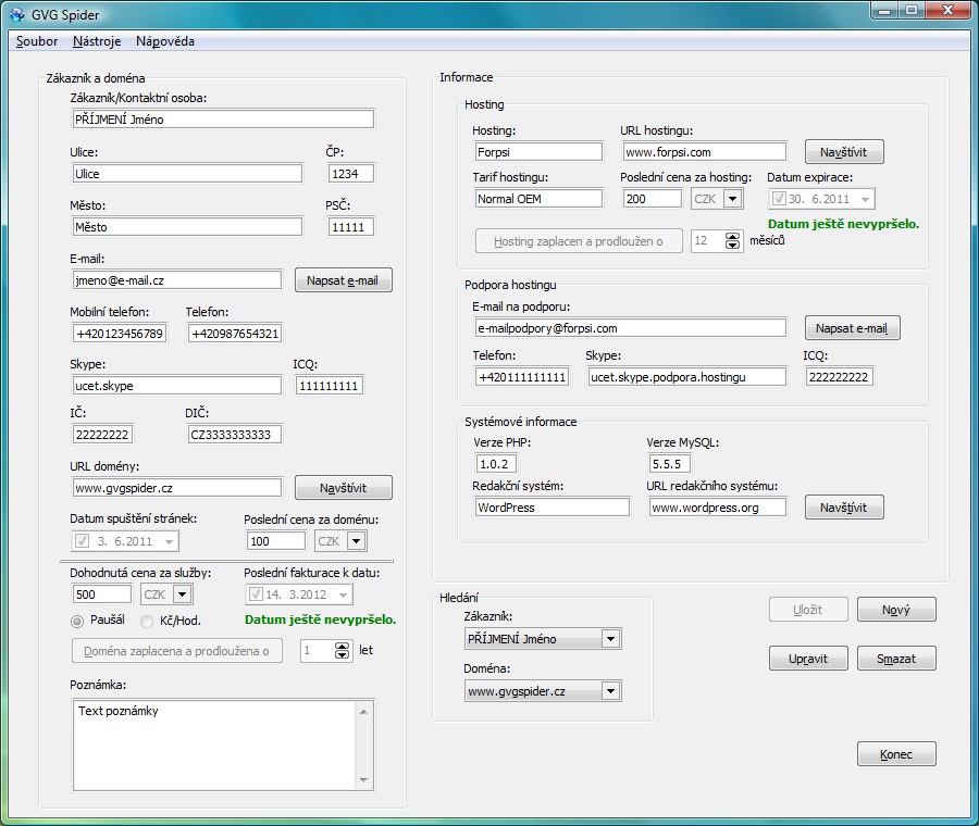 This program is for anyone who is involved in creating custom websites, which includes managing domain names, databases and other important information. It often happens that the customer, after the implementation and launch of the web presentation, asks for its subsequent management. Therefore, it is necessary to make updates to the website, monitor the expiration of the hosting on which the website runs, monitor the expiration of the domain, update the database environment and many other details. However, if there are multiple such jobs, it is easy to lose track and it is very easy to miss an important fact that can have an adverse effect on the managed website. However, GVG Spider can help you in such situations. You just need to enter each customer into its database, fill in all the required fields, set expiration dates and other information and then let it work either in the background, where (depending on the settings) it can check all the important dates at regular intervals or, if automatic checking is not activated, it can check the status of all the important information by simply browsing the database. Another great advantage of the application is the way it works with the database of information. All data are not stored in one central database, but are divided by individual customers, which results in very fast work with the program and also elimination of various possible problems with the database file. In other words, your stored data is completely securely managed and there is no risk of errors even with a large number of data entries.