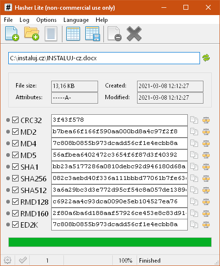 Hasher is used to verify the integrity of files by generating a unique key from the contents of the file, which you can then compare against the other party's data to ensure that the file has not been altered on the way to you or that it has been downloaded correctly. The hashes supported are CRC32, MD2, MD4, MD5, SHA1, SHA256, SHA512, RipeMD128, RipeMD160, ED2K.