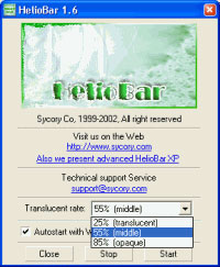 HelioBar is a magical utility that gives you back a piece of desktop stolen by the system tray. The system tray is a strip - usually at the bottom of the screen containing the Start buttons and so on. HelioBar renders the system tray as transparent, thus revealing the entire desktop including any wallpaper.