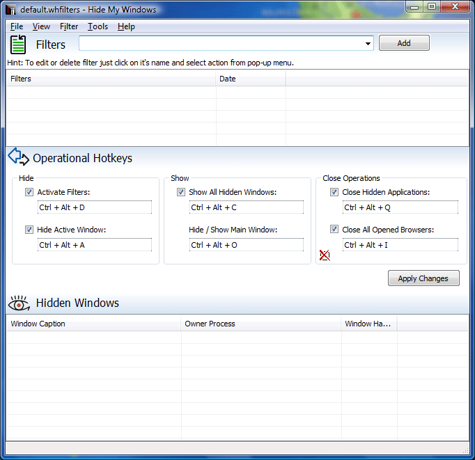 Hide My Windows is a handy utility that helps you hide various application windows and documents from your screen without closing them. This will quickly and easily protect your privacy from the eyes of others. You can hide groups of windows by pressing a secret hotkey. Dalé offers the following options: hide and show windows with the mouse, close the browser, hide, close and open applications, show a list of hidden windows, password protection, hotkey settings and many other convenience features.