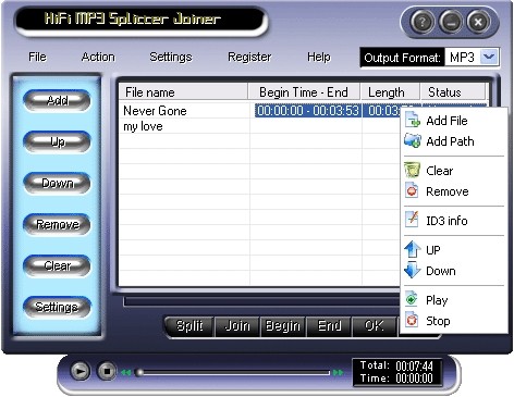 HiFi MP3 Splitter Joiner is a clear tool for working with MP3 files. The program allows you to join or split music files or just parts of them.
