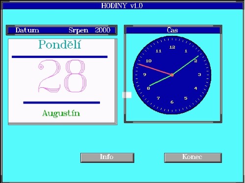 The program graphically displays the time, date, day of the week and who has a holiday using an analog clock. Replaces the DOS Time command, but without the ability to set the time.