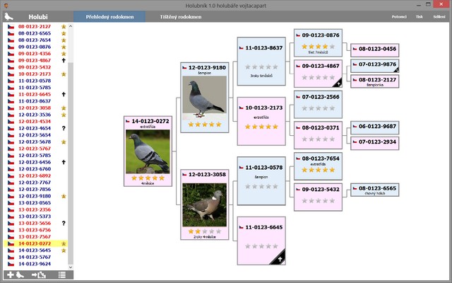 The Pigeon Register is a record-keeping program for fanciers of homing pigeons. The main objective of this program is to make the pedigrees, status and results of pigeons more transparent and to facilitate the breeding of ever faster homing pigeons. It also allows the sorting of pigeons into different categories, their rating, notes and an overview of their age. It also offers a list of pigeons found and flown by other pigeon fanciers, advertising and messaging facilities. Some pigeon fanciers may also appreciate the possibility to share their family tree with selected users. It is because of the latter features that Pigeonnik works as an online database and requires an internet connection and user registration to use it.