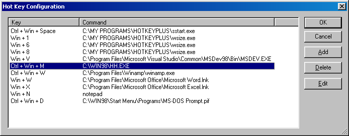 When you launch Hot Key Plus, an icon will appear in the system tray. You can configure (add, edit and delete) hot keys using the context menu. The dialog lists all currently configured keys.