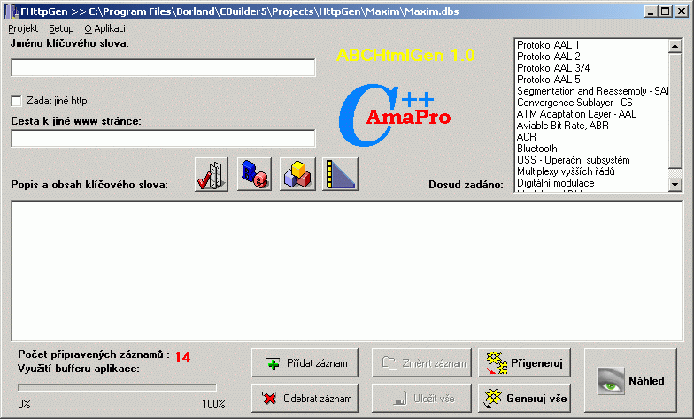 The application can be used, for example, in the presentation of sorted information on the Internet, where frequent data replacement is necessary. The application does not require any intervention in html files. It always re-generates them with all changes. The resulting html files offer a selection field of letters A, B, C....Z, an array with alphabetically sorted entries of each letter. Here, when clicked, a detailed description of the item appears in the third window. All three windows can be graphically modified very easily using forms. Entries can be edited and deleted.