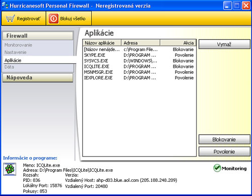 It also monitors all programs connecting to the Internet, mail accounts and local network, and allows you to add rules to them. The program can turn on/off the function of blocking all connections. When unknown programs connect to the Internet, the program asks if you want to allow/block the connection once or permanently.
