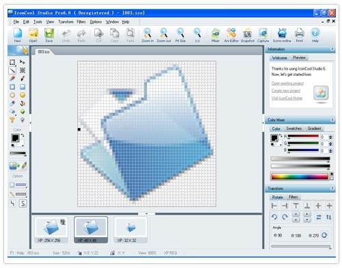 IconCool Studio is a complete solution for editing and creating 32 bit icons. The program includes all the standard graphical editing tools, as well as many diverse effects and fitlers for polished icon design.