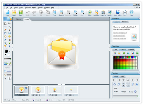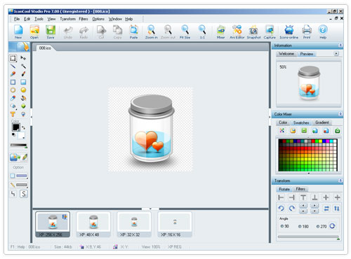 IconCool Studio Pro is a complete tool for editing and creating icons. The program includes all the standard image editing tools, as well as various filters and effects that can be used to enhance icon design. It includes a Mixer tool that can be used to create custom icons using multiple layers and different elements. It also supports editing of GIF, JPG and PNG images. It also provides additional tools for creating CUR and ANI files.