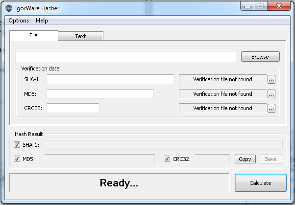 IgorWare Hasher is a SHA-1, MD5 and CRC32 hash generator for Windows operating system. The application does not need to be installed and thus no additional dll libraries or .NET installations are required.