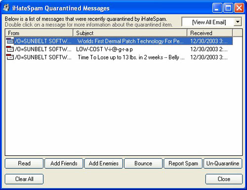 Maximum ease of installation available for Outlook Express, Outlook 2000, 2002 and 2003. The application works in the background and compares the emails you are currently downloading with the spammers list. You can even create your own rules for what should happen to your mail. iHateSpam has been tested by PC World magazine, and the Outlook version was rated very highly, receiving 4.5 stars out of 5 for 96.2% successful spam capture.