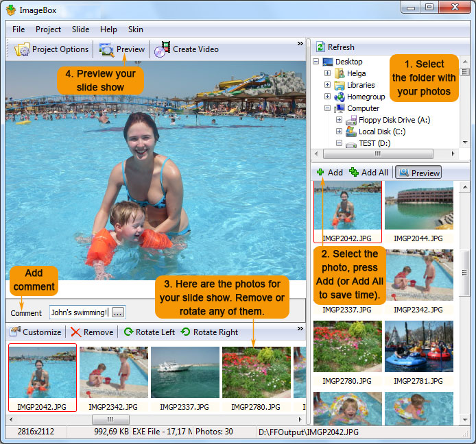 Image Box is a quality tool that allows you to create presentations from your digital photos, images and music executable under exe file. You can add captions, music and sound backgrounds and various effects to your photos. Image Box supports JPEG, GIF, BMP, PNG, TIFF graphic formats and MP3 and WAV audio formats.