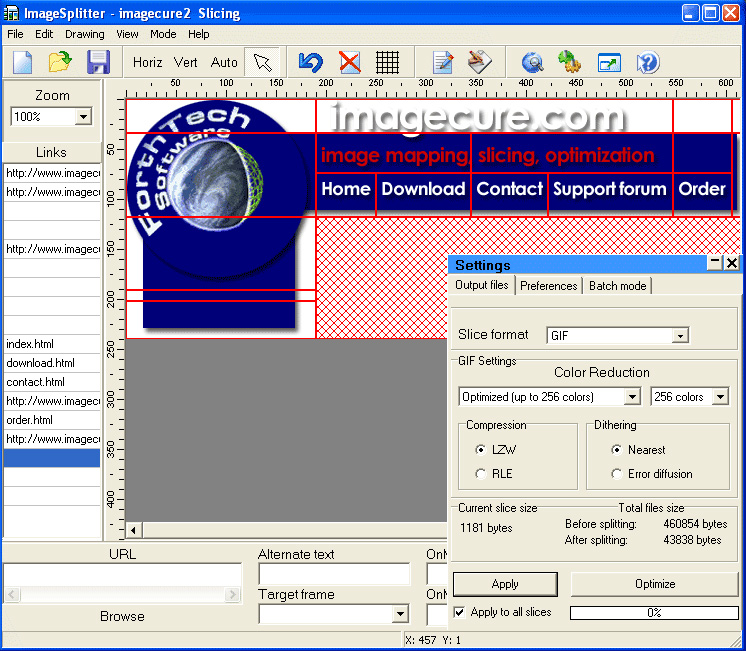 HTML Image Splitter can split your images into multiple pieces. You can specify where the image will be split and set the URL to be triggered when the segment is clicked. The advantage of splitting an image is that they load sequentially and you don't have to wait for the whole thing to load. The app allows you to test the segmented images in your browser before you save them. The app will generate all the code that is needed when you place it on the website. The program supports BMP, JPG, GIF, PNG on input and BMP,JPG, PNG on output.