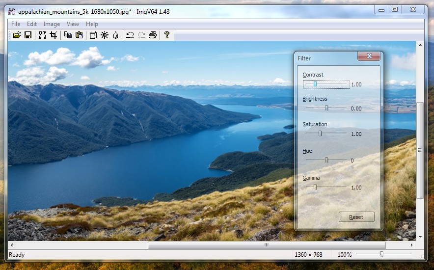 ImgV64 is a photo viewing tool, with basic editing functions ( adjusting sharpness, contrast, brightness, saturation, etc. It supports many formats (GIF, JPG, PNG). Retrieved images are then saved as RLE, PNG, ICO, EMF, WMF, EXIF, GIF or JFIF.