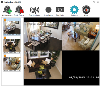 ImWatcher is a professional camera system with support for multiple webcams and IP-cameras. It is possible to monitor and record from many cameras simultaneously and preview multiple cameras in one window. Each camera has its own settings for motion detection, recording and action. If motion is detected, you can configure a program to create a video recording of the event or photo.