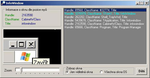 The program is used to find out basic information about windows in the system. It displays the information of the window that is under the currently positioned mouse cursor, namely: handle, classname and title. It also lists all visible and invisible windows on the system. The active window is highlighted. As an added feature, there is also a zoomable view of the mouse cursor surroundings, including the top of the cursor.