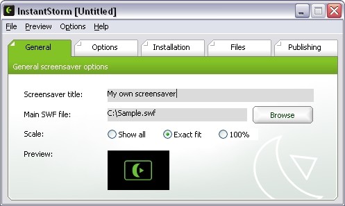 InstantStorm is a windows program for creating flash screensavers. Just choose a SWF file, set the parameters and compile the executable installer. The program includes a wizard to help you create a screensaver in no time.
